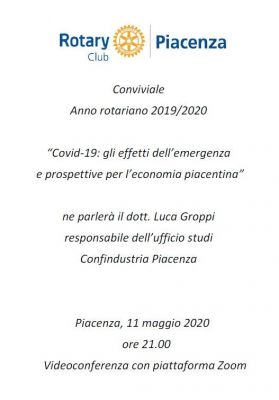 Lunedì 11 maggio, alle ore 21,00, si terrà una conviviale smart sulla piattaforma Zoom, cui parteciperanno i soci dei Club Rotary del Gruppo Piacentino ed eventuali loro ospiti.