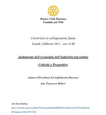 Lunedì 01 Febbraio 2021 si è tenuta la conviviale online in collegamento Zoom, dal titolo "ANDAMENTO DELL'ECONOMIA E DELL'INDUSTRIA PIACENTINA, CRITICITA' E PROSPETTIVE".